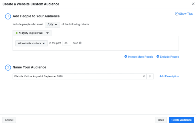 Once you choose your source, you can create your audience. In the example below, I chose “Website” as the source and set up an audience that includes all visitors to 1Eighty Digital’s website for the past 60 days.