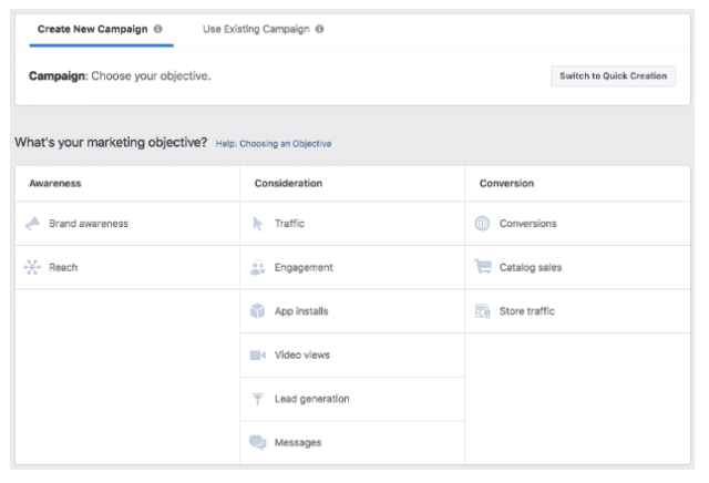 Campaign objectives are divided into 3 sections: