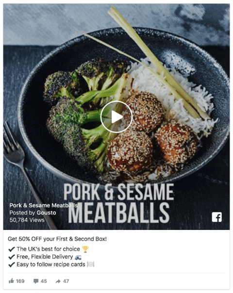 This ad is a great example of a retargeting ad designed to appeal to someone who already has an idea of what Gousto is and needs a little incentive to become a customer. Plus it’s a video ad, which can be a way to stand out from other Facebook ads in your potential customer’s feeds.